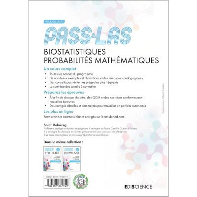 Destiné aux étudiants du Parcours d'accès spécifique santé (PASS), première année des études MMOPK (Médecine, Maïeutique, Odontologie, Pharmacie et Kiné) et aux étudiants de L.AS (Licences Accès Santé), ce manuel complet est conçu pour les aider à pour les aider à assimiler le cours de Biostatistiques, Probabilités et Mathématiques et à réussir leurs examens.Un cours complet
