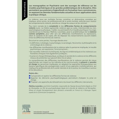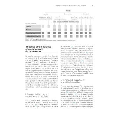 Structuré en seize parties, l'ouvrage aborde ainsi :- La définition, la Biologie, la Psychologie, la Sociologie, l'Économie, la Philosophie et la Criminologie de la violence ;- Les différentes manifestations de la violence selon la personne impliquée, le trouble psychiatrique, son expression, l'environnement ;- Les nouvelles violences (numériques), les figures emblématiques et les violences aux frontières cliniques, mais également juridiques ;- La prise en charge (thérapeutique, juridique et sociale) de la violence et les différents niveaux de prévention qui peuvent être mis en place.