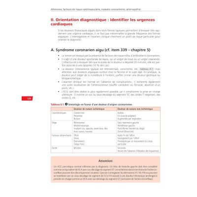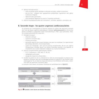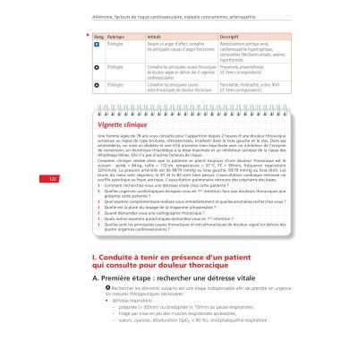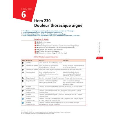 Une partie Connaissances composée de 22 chapitres correspondant chacun à un item de la discipline. Chaque chapitre commence systématiquement par les situations de départ, un tableau de hiérarchisation des connaissances en rangs A B, une vignette clinique, puis développe la thématique avec l'indication des rangs au fil du texte (les rangs C pour aller plus loin sont abordés) étayée de points clés tableaux et figures de rubriques sur les notions à retenir et se termine par des questions isolées avec correction en fin d'ouvrage qui permettent de tester immédiatement ses connaissances sur l'item abordé ;