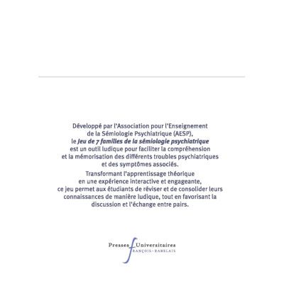 Développé par l'association pour l'enseignement de la Sémiologie psychiatrique, le jeu de 7 familles de la Sémiologie psychiatrique est un outil ludique pour faciliter la compréhension et la mémorisation des différents troubles psychiatriques et des symptômes associés.