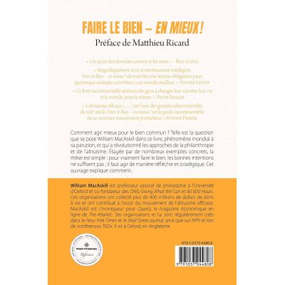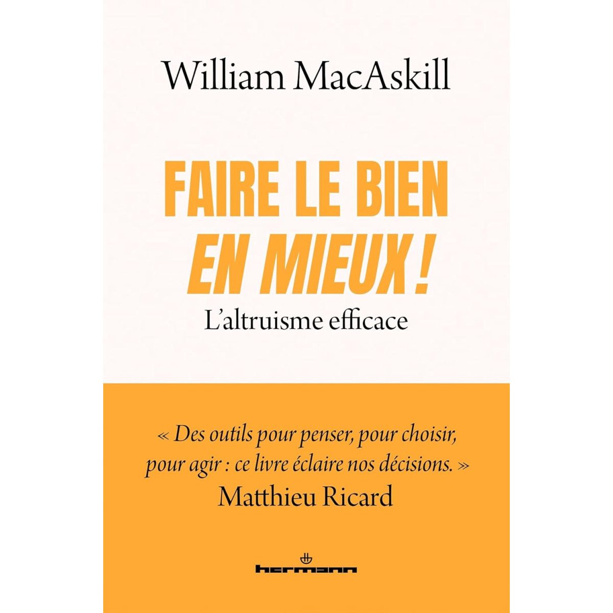 Comment agir mieux pour le bien commun ? Telle est la question que se pose William MacAskill dans ce livre, phénomène mondial à sa parution, et qui a révolutionné les approches de la philanthropie et de l’altruisme. Étayée par de nombreux exemples concrets, la thèse est simple : pour vraiment faire le bien, les bonnes intentions ne suffisent pas ; il faut agir de manière réfléchie et stratégique. Cet ouvrage explique comment.