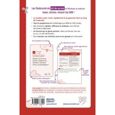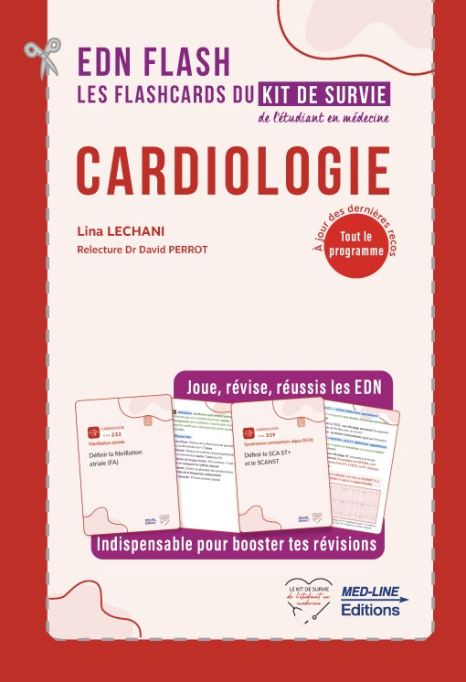 EDN FLASH - Les flashcards du KIT DE SURVIE de l’étudiant en Médecine - CARDIOLOGIE. Jouer, réviser, réussir les EDN :• La solution pour revoir rapidement le programme tout au long de l’externat.• Tout le programme de Cardiologie aux EDN (à jour des dernières recommandations) en 193 cartes.• Des révisions rapides, efficaces et ludiques, sous forme de cartes à découper.• Un format qui se glisse partout : dans sa blouse, son sac, ou sur un coin de bureau.• Pour booster ses révisions seul ou en groupe en s’amusant.Lina Lechani est interne, fondatrice du Kit de survie de l’étudiant en Médecine. Le Dr David Perrot est cardiologue à la Clinique Ambroise Paré-Hartmann, ancien chef de clinique des universités - Assistant des Hôpitaux de Paris à l’HEGP.
