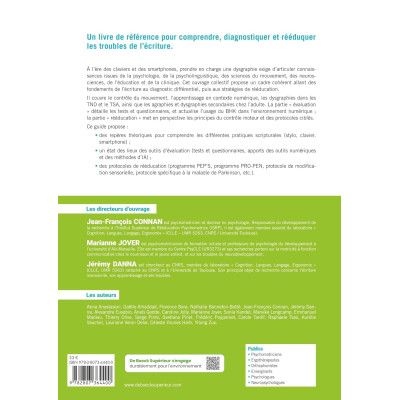 Il couvre le contrôle du mouvement, l’apprentissage en contexte numérique, les dysgraphies dans les TND et le TSA, ainsi que les agraphies et dysgraphies secondaires chez l’adulte. La partie « évaluation » détaille les tests et questionnaires, et actualise l’usage du BHK dans l’environnement numérique ; la partie « rééducation » met en perspective les principes du contrôle moteur et des protocoles ciblés.