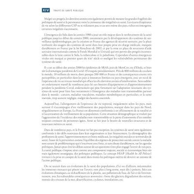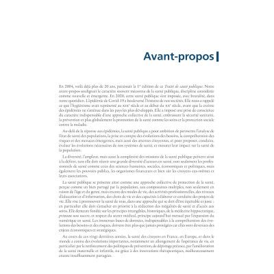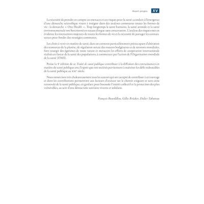 Cette nouvelle édition ouvre le champ de la Santé publique entendu comme « un ensemble de savoirs, de savoir-faire, de pratiques et de règles juridiques qui visent à connaître, expliquer, à préserver, à protéger et à promouvoir l’état de santé des personnes » à tous ceux, qui, du citoyen au professionnel de santé, de la personne malade au décideur des politiques de santé, cherchent à partager la réflexion jamais close, sur les choix de santé et de société, les enjeux nationaux comme internationaux à travers :• Les fondements de la Santé publique : ses définitions, son histoire, les déterminants de santé, les risques et l’épidémiologie, la sécurité sanitaire, l’éthique, le droit des personnes malades, la place et le rôle des associations de malades ;• Les grandes fonctions de la Santé publique : la veille, l’alerte, la surveillance, la prévention et la promotion de la santé, la recherche en santé publique ;• L’état de santé en France et dans le monde : la démographie, les inégalités de santé et un focus aux âges extrêmes de la vie – l’enfance et le vieillissement.
