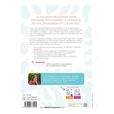 Suivez la neuropsychologue Cathy Assenheim dans les 4 étapes de son programme sur mesure pour évaluer rapidement votre situation, puis reprendre le contrôle. Grâce à ce guide perso, vous retrouverez votre énergie et réduirez :
