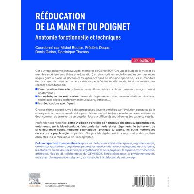 Cet ouvrage présente les travaux des membres du GEMMSOR (Groupe d'étude de la main et du membre supérieur en orthèse et rééducation) et retranscrit les savoir-faire et les connaissances acquis grâce à plusieurs décennies d'expérience dans ce domaine spécialisé. Les 41 chapitres de l'ouvrage décrivent de manière méthodique réfléchie et référencée les domaines les plus récents de rééducation :
