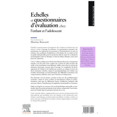 Échelles et questionnaires d'évaluation chez l'enfant et l'adolescent s'est imposé comme l'ouvrage de référence. La présentation structurée des instruments, les indications de passation et d'interprétation, la mise en évidence des conditions d'utilisation et des limites de ces outils en fait un guide indispensable pour les praticiens afin de mener les évaluations psychologiques dans les thérapies et dans les bilans cliniques, mais aussi pour des expertises. Cette 2e édition en un seul volume dirigée par le Professeur Martine Bouvard est largement enrichie à la fois pour tenir compte des versions les plus récentes des outils et des instruments nouvellement validés, mais aussi en raison des domaines désormais couverts dans l'ouvrage. La complexité du développement de l'enfant et de l'adolescent est prise en compte à travers les divers domaines abordés, depuis la Psychopathologie de l'enfant aux troubles émotionnels ou motivationnels, des difficultés d'attention aux comportements addictifs, mais aussi l'anxiété et la dépression. Des domaines ont été ajoutés, certains en lien avec des problématiques sociétales comme le stress scolaire, le harcèlement scolaire, le perfectionnisme, ainsi que les différentes formes d'addiction (incluant celle aux jeux vidéos), l'attachement, la régulation émotionnelle ou l'autisme. Enfin, un chapitre est consacré à la Psychopathologie maternelle, en particulier dans la période périnatale, pour mieux comprendre l'environnement de l'enfant dans les premiers instants de sa vie. Cette nouvelle édition, indispensable pour tous les professionnels de la francophonie qui travaillent avec des enfants et des adolescents (psychiatres, psychologues professionnels travaillant en milieu scolaire) et pour ceux qui s'y destinent les aidera à mieux diagnostiquer et prendre en charge leurs patients. Martine Bouvard est professeur émérite en Psychologie clinique, psychologue et psychothérapeute, laboratoire de Psychologie et Neuro-Cognition (LPNC) université Savoie Mont Blanc Chambéry.