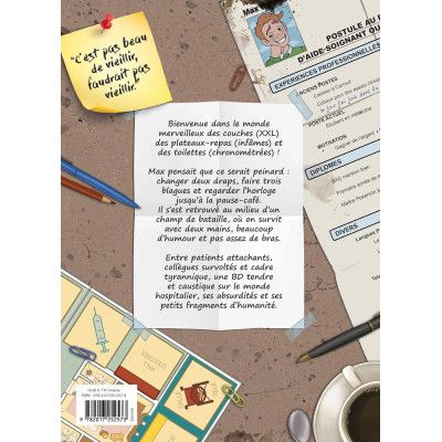 Bienvenue dans le monde merveilleux des couches (XXL) des plateaux-repas (infâmes) et des toilettes (chronométrées) !Max pensait que ce serait peinard : changer deux draps, faire trois blagues et regarder l'horloge jusqu'à la pause-café. Il s'est retrouvé au milieu d'un champ de bataille, où on survit avec deux mains, beaucoup d'humour et pas assez de bras.Entre patients attachants, collègues survoltés et cadre tyrannique, une BD tendre et caustique sur le monde hospitalier, ses absurdités et ses petits fragments d'humanité.