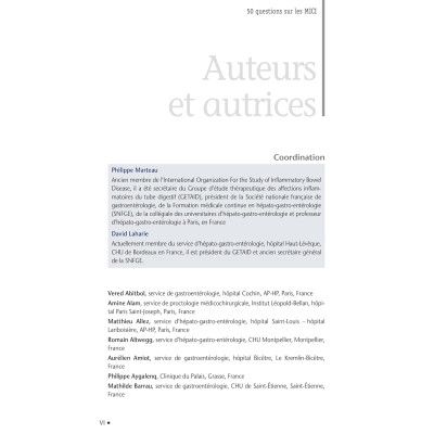 David Laharie : actuellement membre du service d’Hépato-Gastro-Entérologie, hôpital Haut-Lévêque, CHU de Bordeaux en France, il est président du GETAID et ancien secrétaire général de la SNFGE.Philippe Marteau : ancien membre de l’International Organization For the Study of Inflammatory Bowel Disease, il a été secrétaire du Groupe d’étude thérapeutique des affections inflammatoires du tube digestif (GETAID), président de la Société nationale française de Gastro-Entérologie, de la Formation médicale continue en Hépato-Gastro-Entérologie (SNFGE), de la collégiale des universitaires d’Hépato-Gastro-Entérologie et professeur d’Hépato-Gastro-Entérologie à Paris.