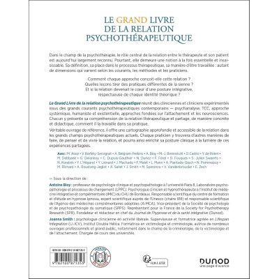 Le Grand Livre de la relation psychothérapeutique réunit des cliniciennes et cliniciens expérimentés issus des grands courants psychothérapeutiques contemporains — Psychanalyse, TCC, approche systémique, humaniste et existentielle, approches fondées sur l’attachement et les Neurosciences. Chacun y présente sa compréhension de la relation thérapeutique et partage, de manière concrète et didactique, comment il la travaille dans sa pratique.