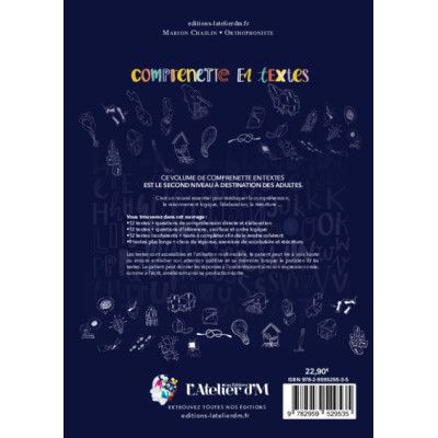 Comprenette en Textes Adultes - Niveau 2. Vous trouverez dans cet ouvrage : - 12 textes suivis de questions de compréhension directe et d’un exercice d’élaboration - 12 textes suivis de questions d’inférences, d’un vrai ou faux et d’un exercice d’ordre logique - 12 textes incohérents suivis d’un texte à compléter afin de le rendre cohérent - 9 textes plus longs suivis d’un choix de réponse, d’exercices de vocabulaire et d’une réécriture. Les textes sont variés et abordent des thèmes du quotidien, c’est un outil essentiel pensé pour être accessible et multimodal. Le matériel que je vous propose vise à atteindre les objectifs suivants : stimuler la compréhension verbale ; améliorer l’expression orale et/ou écrite ; stimuler l’attention auditive ; renforcer la mémoire immédiate ; travailler la lecture à haute voix.