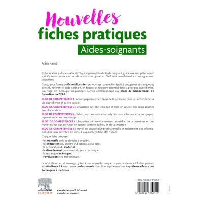 Collaborateur indispensable de l'équipe paramédicale, l'aide-soignant, grâce aux compétences et spécificités acquises au cours de sa formation, joue un rôle fondamental dans l'accompagnement du patient. Conçu sous forme de fiches illustrées, cet ouvrage couvre l'intégralité des gestes techniques et soins du référentiel aide-soignant en faisant un support essentiel dans la pratique quotidienne. L'ouvrage est découpé en plusieurs parties correspondant aux blocs de compétences de formation du DEAS. BLOC DE COMPÉTENCES 1 : Accompagnement et soins de la personne dans les activités de sa vie quotidienne et sa vie sociale BLOC DE COMPÉTENCES 2 : Évaluation de l'état clinique et mise en œuvre des soins adaptés en collaboration BLOC DE COMPÉTENCES 3 : Établir une communication adaptée pour informer et accompagner la personne et son entourage BLOC DE COMPÉTENCES 4 : Entretien de l'environnement immédiat de la personne et des matériels liés aux activités, en tenant compte du lieu et de la situation BLOC DE COMPÉTENCES 5 : Travail en équipe pluriprofessionnelle et traitement des informations liées aux activités de soins à la qualité/gestion des risques Chaque fiche propose : Les objectifs de la technique à acquérir Les indications ou contre-indications à respecter La préparation du matériel Le déroulement du soin ou du geste technique La technique en images L'évaluation et la transmission. La 6e édition de cet ouvrage, grâce à une nouvelle maquette plus moderne et lisible, permet aux étudiants AS ainsi qu'aux professionnels d'accéder rapidement à une synthèse efficace des techniques à maîtriser. L'auteur : Alain Ramé est ancien cadre enseignant à l'IFSI-IFAS à l'hôpital Pitié-Salpêtrière (Paris).