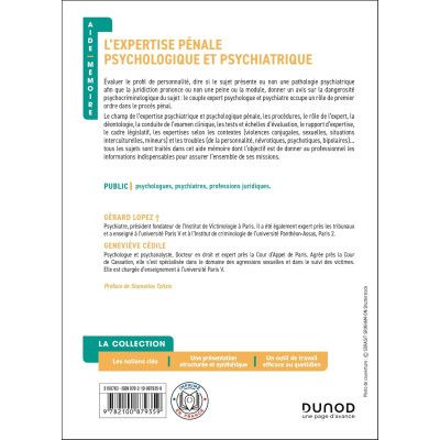 Évaluer le profil de personnalité, dire si le sujet présente ou non une pathologie psychiatrique afin que la juridiction prononce ou non une peine ou la module, donner un avis sur la dangerosité psycho-criminologique du sujet : le couple expert psychologue et psychiatre occupe un rôle de premier ordre dans le procès pénal. Le champ de l’expertise psychiatrique et psychologique pénale, les procédures, le rôle de l’expert, la Déontologie, la conduite de l’examen clinique, les tests et échelles d'évaluation, le rapport d’expertise, le cadre législatif, les expertises selon les contextes (violences conjugales, sexuelles, situations interculturelles, mineurs) et troubles (de la personnalité, névrotiques, psychotiques, bipolaires)… tous les sujets sont traités dans cet aide mémoire dont l’objectif est de donner au professionnel les informations indispensables pour assurer l’ensemble de ses missions. Les auteurs : Gérard Lopez est psychiatre, président fondateur de l’Institut de Victimologie, et vice-président du Conseil national professionnel de Médecine légale – expertises médicales.Geneviève Cédile est psychologue, psychanalyste, docteur en droit, expert près la Cour d'appel de Paris, agrée près la Cour de Cassation.