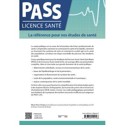 La Santé publique constitue un champ disciplinaire fondamental dans la formation des futurs professionnels de santé. Son enseignement, dès la première année des études de santé, poursuit un double objectif : transmettre aux étudiants des notions essentielles pour comprendre les enjeux contemporains de santé, et les sensibiliser à l’importance d’une approche collective, intégrée et responsable du soin. Cet ouvrage propose une présentation structurée et actualisée des principaux concepts de Santé publique, alliant rigueur scientifique et clarté pédagogique. Conçu pour rendre la discipline accessible et concrète, ce livre fournit aux étudiants tous les outils nécessaires pour approfondir leur compréhension et optimiser leurs chances de réussite aux épreuves du PASS-LAS. Pour faciliter l’appropriation des connaissances, chaque chapitre se conclut par un résumé des points clés enrichi d’infographies et complété par des exercices d’entraînement, sous forme de QCM ou de textes à trous. Ces dispositifs permettent aux étudiants d’évaluer leurs acquis, de consolider leurs compétences et de se préparer de manière efficace aux exigences académiques de leur cursus. L'autrice : Marie-Pierre Tavolacci est médecin de Santé publique au Centre d’Investigation Clinique du CHU de Rouen et professeur associée à l’Université de Rouen.