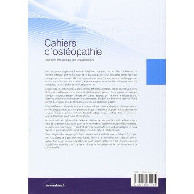 Les symptomatologies douloureuses lombaires irradiant ou non dans la fesse et le membre inférieur sont nombreuses et fréquentes. Il existe un amalgame sémantique qui mélange tous ces tableaux cliniques pour n'en former qu'un qui, par abus de langage, est appelé souvent à tort « sciatique ». Ce terme englobe aussi bien les lombalgies que les cruralgies, les sciatalgies et les sciatiques vraies. Les auteurs se sont attachés à proposer des définitions simples, claires et précises de ces différentes pathologies pour éviter la confusion des genres. Ils proposent un examen clinique rigoureux, tenant compte des signes d'alerte, de l'imagerie médicale et des examens biologiques complémentaires permettant d'établir un diagnostic ostéopathique positif d'exclusion afin d'entreprendre ou non un traitement adapté. Chaque tableau clinique correspond à un support spécifique anatomique, physiologique et biomécanique précis, et le diagnostic est établi au travers d'un protocole systématisé de prise en charge du patient utilisant des tests ostéopathiques, orthopédiques et neurolo­giques décrits de façon claire et rigoureuse. Au travers de cas cliniques tirés de leur expérience, les auteurs décrivent de façon didac­tique et largement illustrée un panel de normalisations aussi bien structurelles, viscérales, fasciales que crâniennes. Ils traitent ainsi la complexité des lombosciatalgies et nous livrent ce que l'Ostéopathie peut apporter comme moyen thérapeutique. Dans la lignée des ouvrages précédents constituant la collection des «Cahiers d'Ostéopa­thie », la clarté et la précision des auteurs, fidèles à la conception holistique de l'Ostéo­pathie, font de cet ouvrage une référence pour tous les praticiens et les étudiants voulant acquérir une expertise dans la prise en charge de ces patients et de contribuer ainsi à la santé durable.
