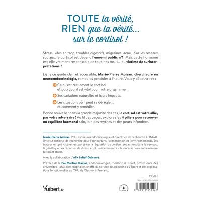 TOUTE la vérité, RIEN que la vérité… sur le cortisol ! Stress, kilos en trop, troubles digestifs, migraines, acné… Sur les réseaux sociaux, le cortisol est devenu l’ennemi public n°1. Mais cette hormone est-elle vraiment responsable de tous nos maux… ou victime de surinterprétations ? Dans ce guide clair et accessible, Marie-Pierre Moisan, chercheure en Neuroendocrinologie, remet les pendules à l’heure. Vous y découvrirez : Ce qu’est réellement le cortisol et pourquoi il est vital pour notre organisme. Ses variations naturelles et leurs impacts. Les situations où il peut se dérégler… et comment y remédier. Bonne nouvelle : dans la grande majorité des cas, le cortisol est votre allié, pas votre adversaire ! Au fil des pages, explorez les 4 piliers pour retrouver un équilibre hormonal sain, loin des mythes et des peurs infondées. L'auteur : Marie-Pierre Moisan, PhD, est neuroendocrinologue et directrice de recherche à l’INRAE (Institut national de recherche pour l’agriculture, l’alimentation et l’environnement). Ses travaux ont principalement porté sur la régulation du cortisol, ses actions dans le cerveau, la génétique des réponses de stress, et plus récemment sur les interactions entre alimentation et stress.