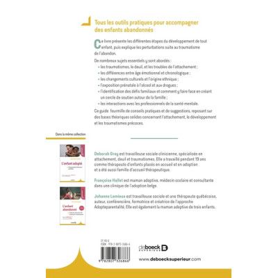 Ce livre présente les différentes étapes du développement de tout enfant, puis explique les perturbations vécues par l'enfant suite au traumatisme de l'abandon. Il fourmille de conseils pratiques et de suggestions, le tout reposant sur des bases théoriques solides concernant l'attachement, le développement et les traumatismes précoces.